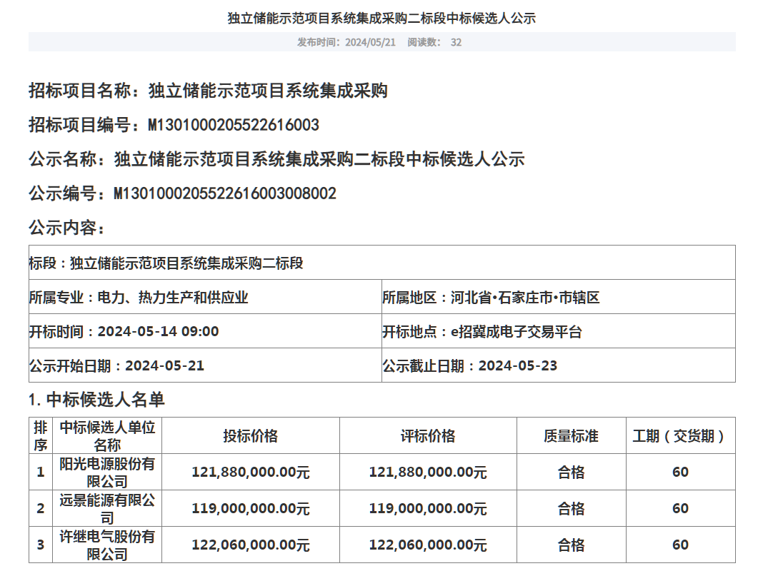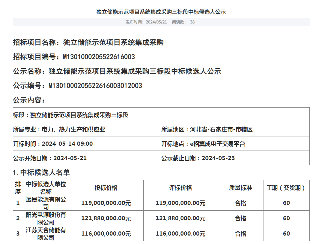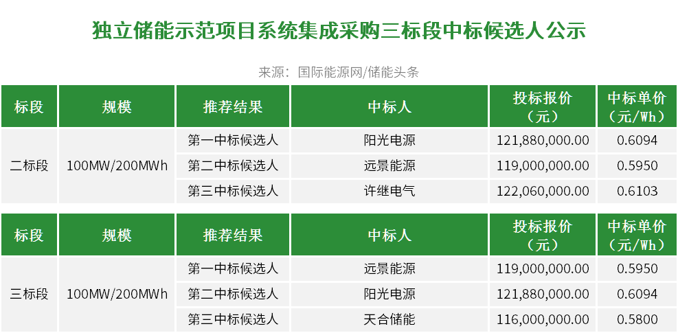 第一中标候选:阳光电源股份有限公司,报价12,188万元,折合单价0.609元/Wh;