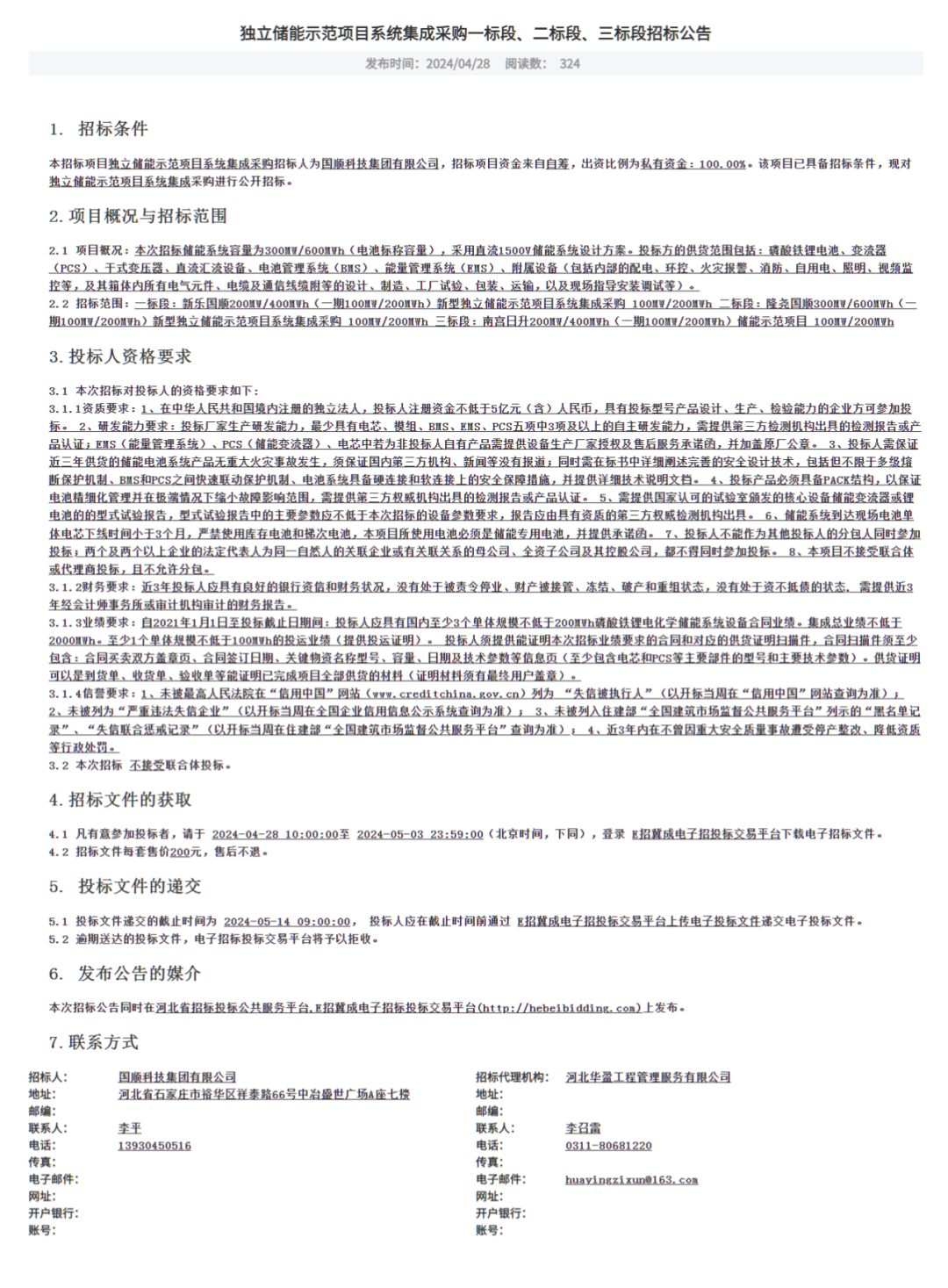 5月21日,国顺科技集团有限公司发布独立储能示范项目系统集成采购二标段、三标段中标候选人公示,本次招标总规模为300MW/600MWh。