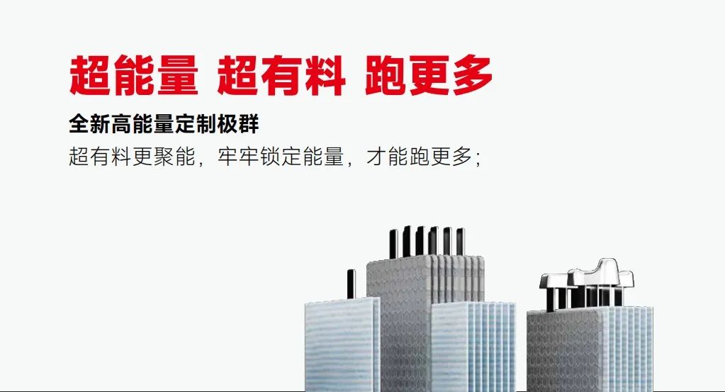 超能量+石墨烯专利技术电池采用全新高能量定制极群,超有料更聚能,牢牢锁定能量,才能跑更多。