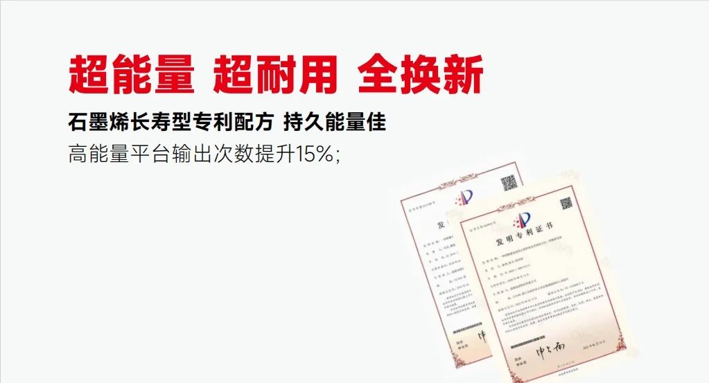 超能量+石墨烯专利技术电池具备石墨烯长寿型专利配方,持久能量佳,高能量平台输出次数提升15%。