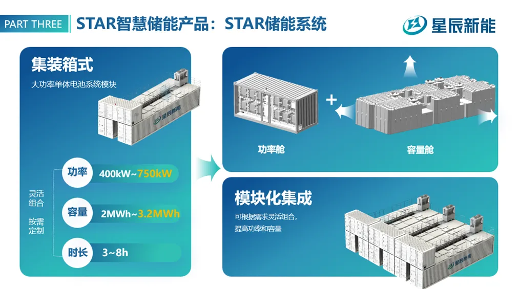 采用搭积木式的模块化集成方案,根据客户需求及所需的储能时长,进行个性化的搭配与组合。这一设计使得星辰新能的储能系统在功率与容量上实现了解耦,从而能够更灵活、更高效、更经济地满足各种应用场景的需求。