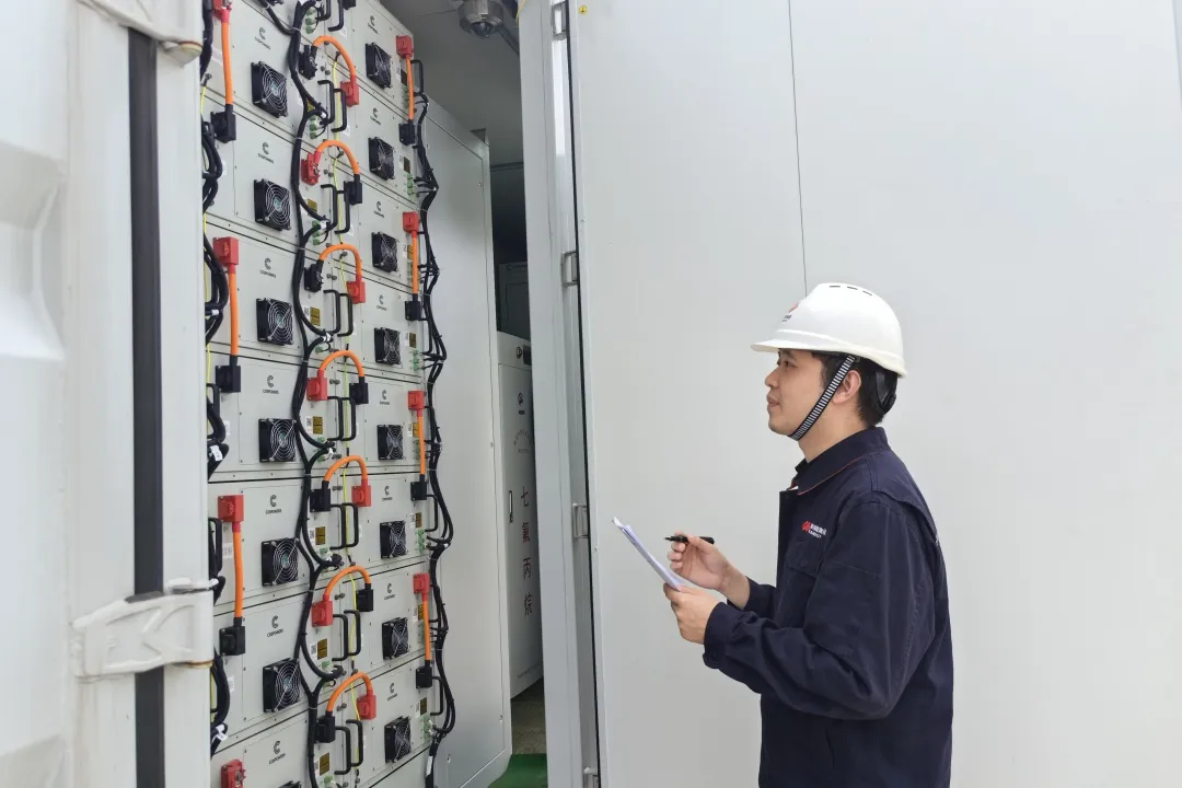 图为技术人员巡视储能电池舱