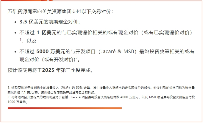 2025年2月18日,五矿资源有限公司宣布与英美资源集团(Anglo American)达成股权收购协议,将以不超过5亿美元的对价收购其巴西镍业公司(Brazil Nickel,以下简称“巴西镍业”)100%股权,其中包括3.5亿现金对价及1.5亿美元或有对价。此次收购作为对巴西的首笔投资,将进一步巩固五矿资源在全球矿业的战略布局。