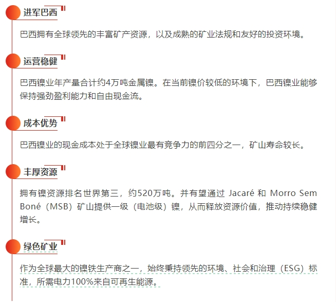 在稳健运营的同时,巴西镍业凭借全球第三大镍资源,为未来扩张奠定了坚实基础。Jacaré 和 MSB 作为其重要的开发项目,将进一步推动公司产量增长,受益于全球新能源产业对镍金属日益增长的需求,抓住全球低碳转型带来的新机遇, 为未来业务发展提供强劲支撑。