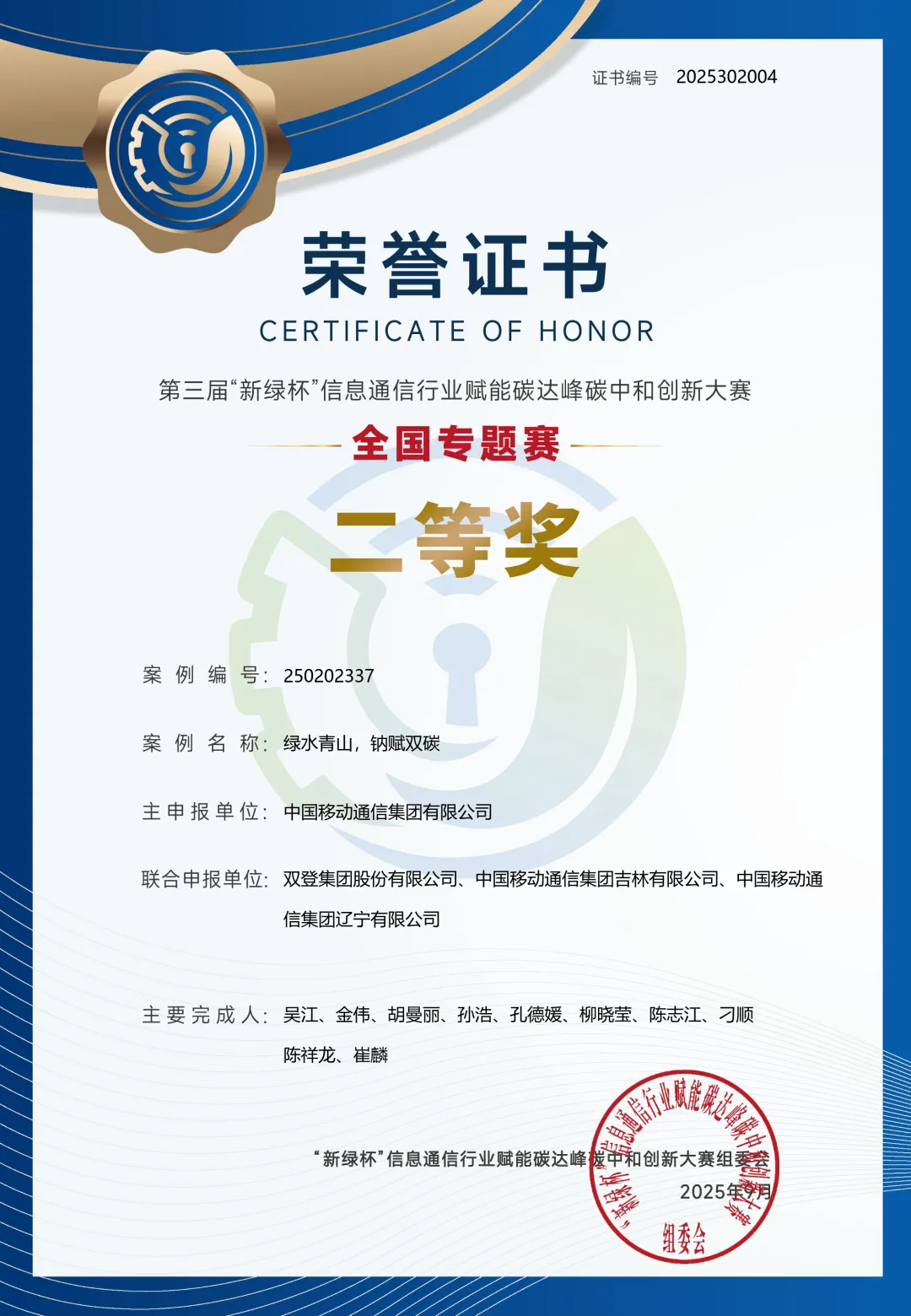 由双登股份与中国移动通信集团有限公司联合攻关的“绿水青山,钠赋双碳”项目,凭借钠离子电池在绿色储能领域的创新探索,成功斩获全国专题赛二等奖。