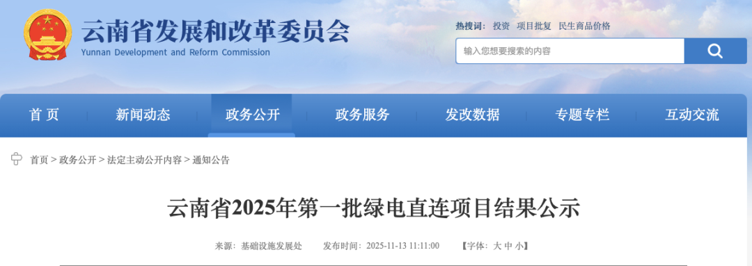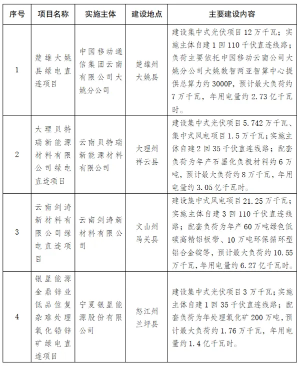 按照《国家发展改革委 国家能源局关于有序推动绿电直连发展有关事项的通知》(发改能源〔2025〕650号)、《云南省发展和改革委员会 云南省工业和信息化厅 云南省能源局关于〈云南省推动绿电直连建设实施方案〉的通知》(云发改能源〔2025〕577号)的有关规定,云南省发展改革委会同省工业和信息化厅、云南省能源局组织各州(市)开展绿电直连项目申报,经专家评审、听取相关部门和电网企业意见后,拟确定4个符合绿电直连条件的项目进入2025年第一批绿电直连项目清单,也是全国范围为第一批绿电直连项目。