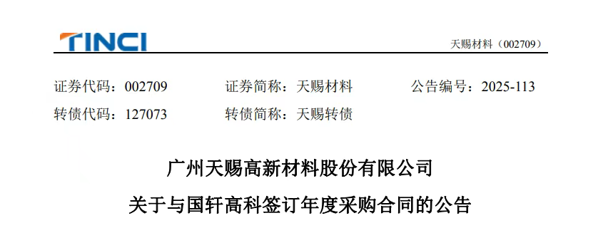 获悉,11月6日,天赐材料公告,全资子公司九江天赐与国轩高科签订《年度采购合同》,国轩高科2026-2028年度向九江天赐采购预计总量为87万吨的电解液产品,实际采购量以经双方确认的《采购订单》为准。