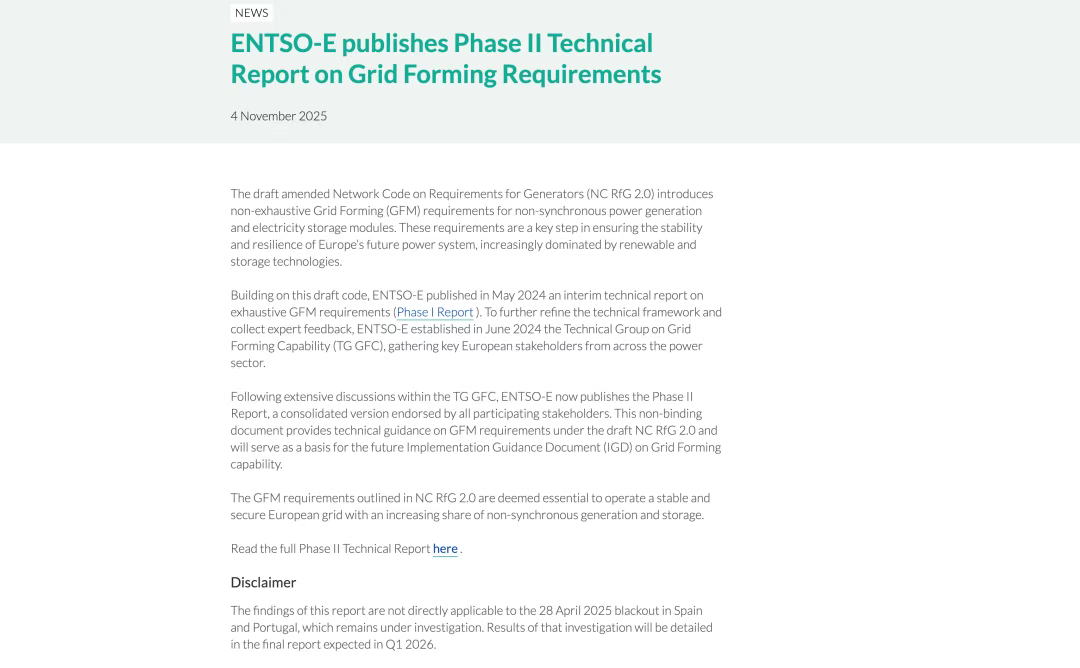 对于电池开发商而言,其影响立竿见影:该报告正式规定,储能系统及其相关的电源管理系统必须具备与同步电机相当的电压控制、惯性响应和频率调节功能,并通过并网逆变器功能实现,包括在电网扰动期间也能正常工作。