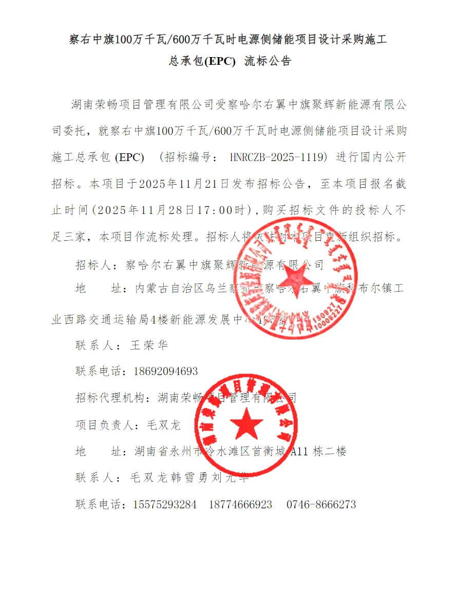 近日,察哈尔右翼中旗聚辉新能源有限公司发布察右中旗100万千瓦/600万千瓦时电源侧储能项目设计采购施工总承包(EPC)流标公告。