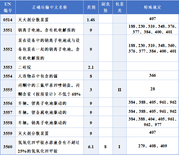 电动车辆:修正后的UN 3171条目仅适用“在安装电池运输情况下的由湿电池、钠金属电池或钠合金电池驱动的车辆和设备”,对于“车辆,锂离子电池驱动的”“车辆,锂金属电池驱动的”和“车辆,钠离子电池驱动的”3种原来按照UN 3171条目运输的货物,修正后应当分别按照UN 3556、UN 3557和UN 3558条目进行运输。