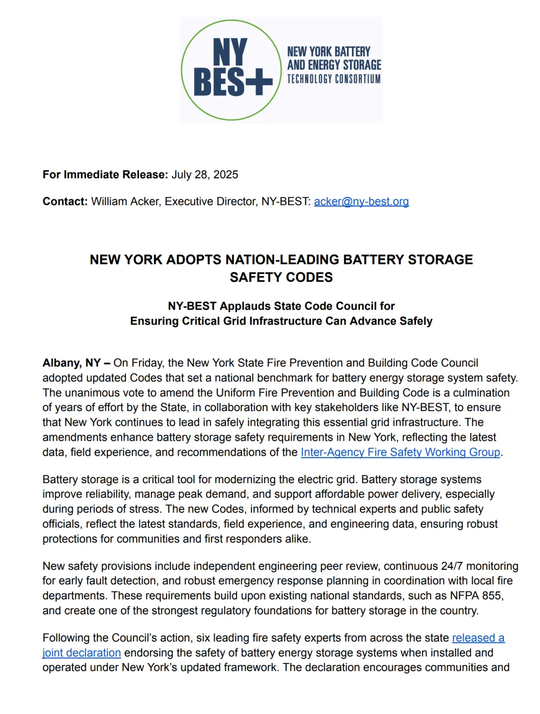 这套新规的形成历时多年筹备,由纽约州政府联合NY-BEST(纽约电池与储能技术联盟)等行业组织共同推进。
