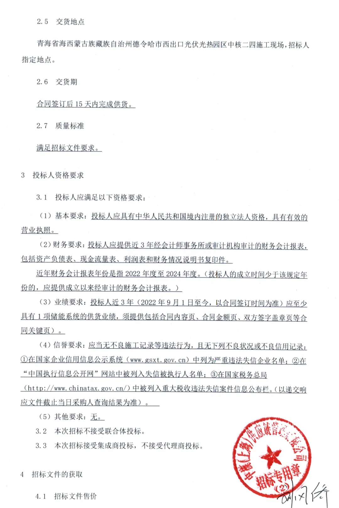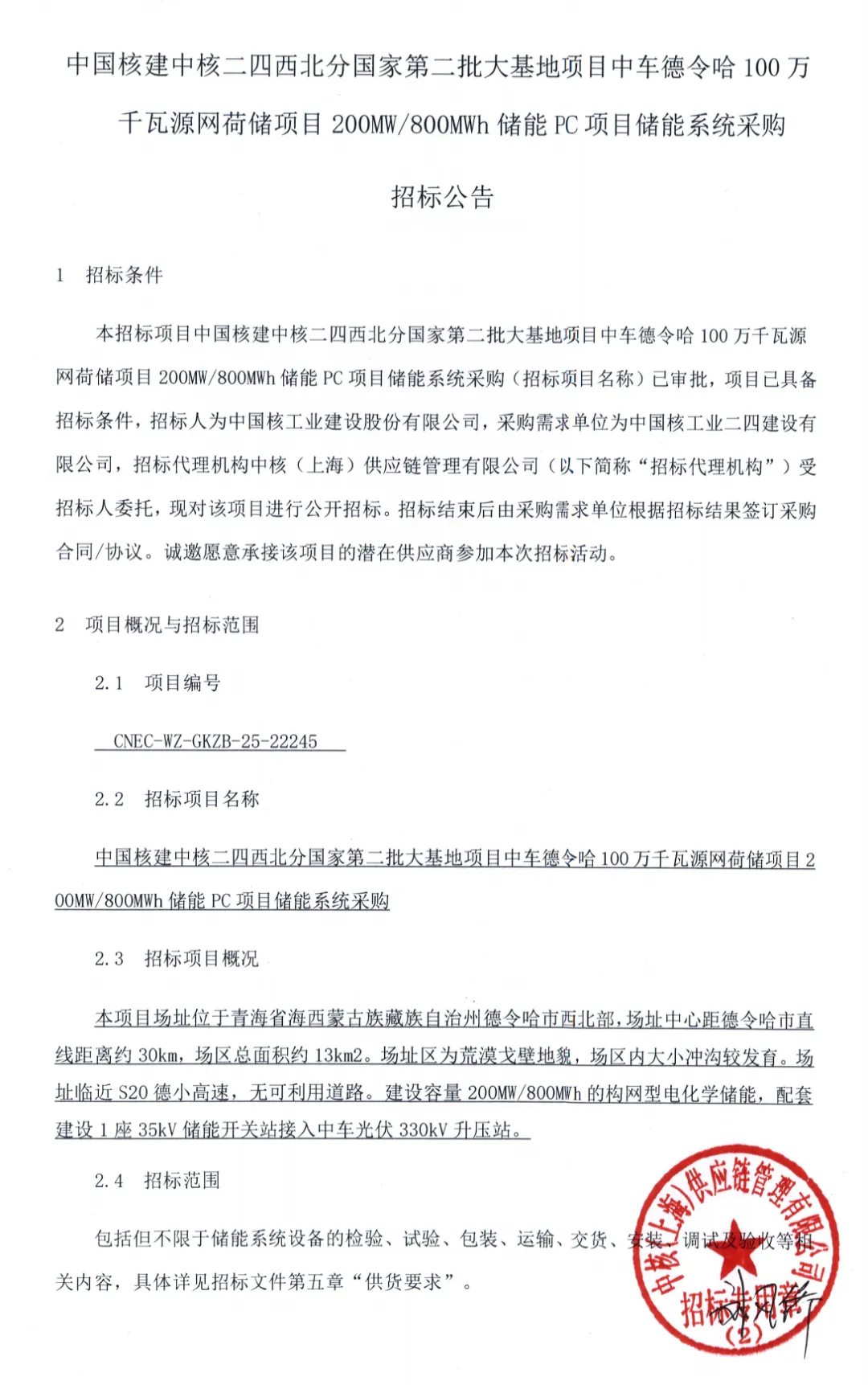 2025年12月3日,中核集团发布中国核建中核二四西北分国家第二批大基地项目中车德令哈100万千瓦源网荷储项目200MW/800MWh储能PC项目储能系统采购招标公告。