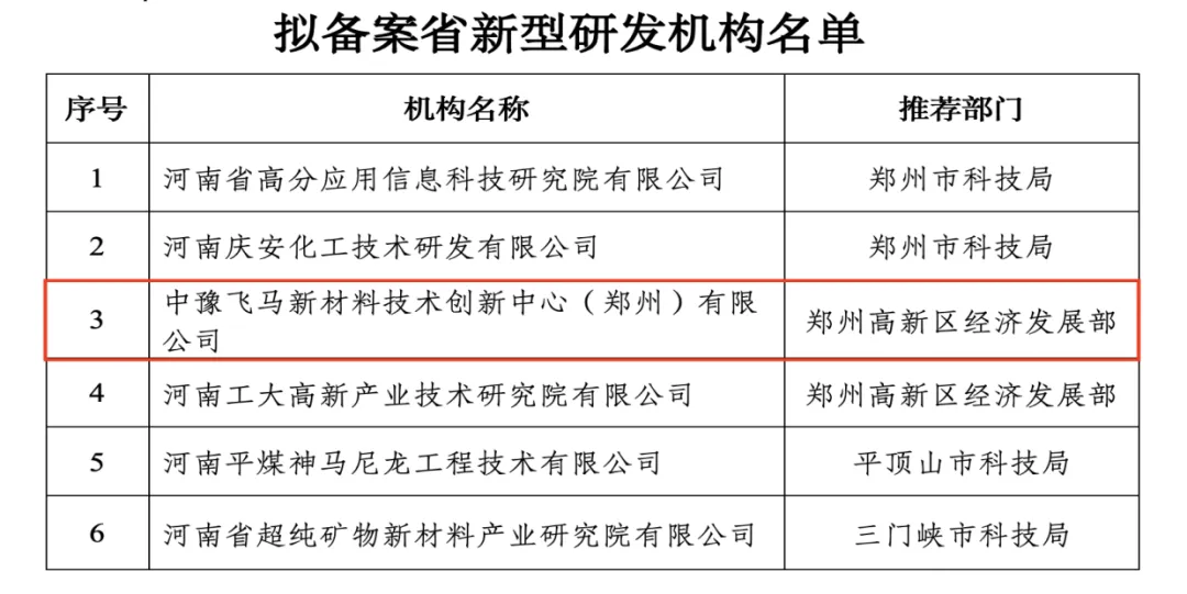 近日,河南省科学技术厅发布的《关于2025年河南省拟备案新型研发机构的公示》,中豫飞马新材料技术创新中心(郑州)有限公司获批“河南省新型研发机构”已完成公示。