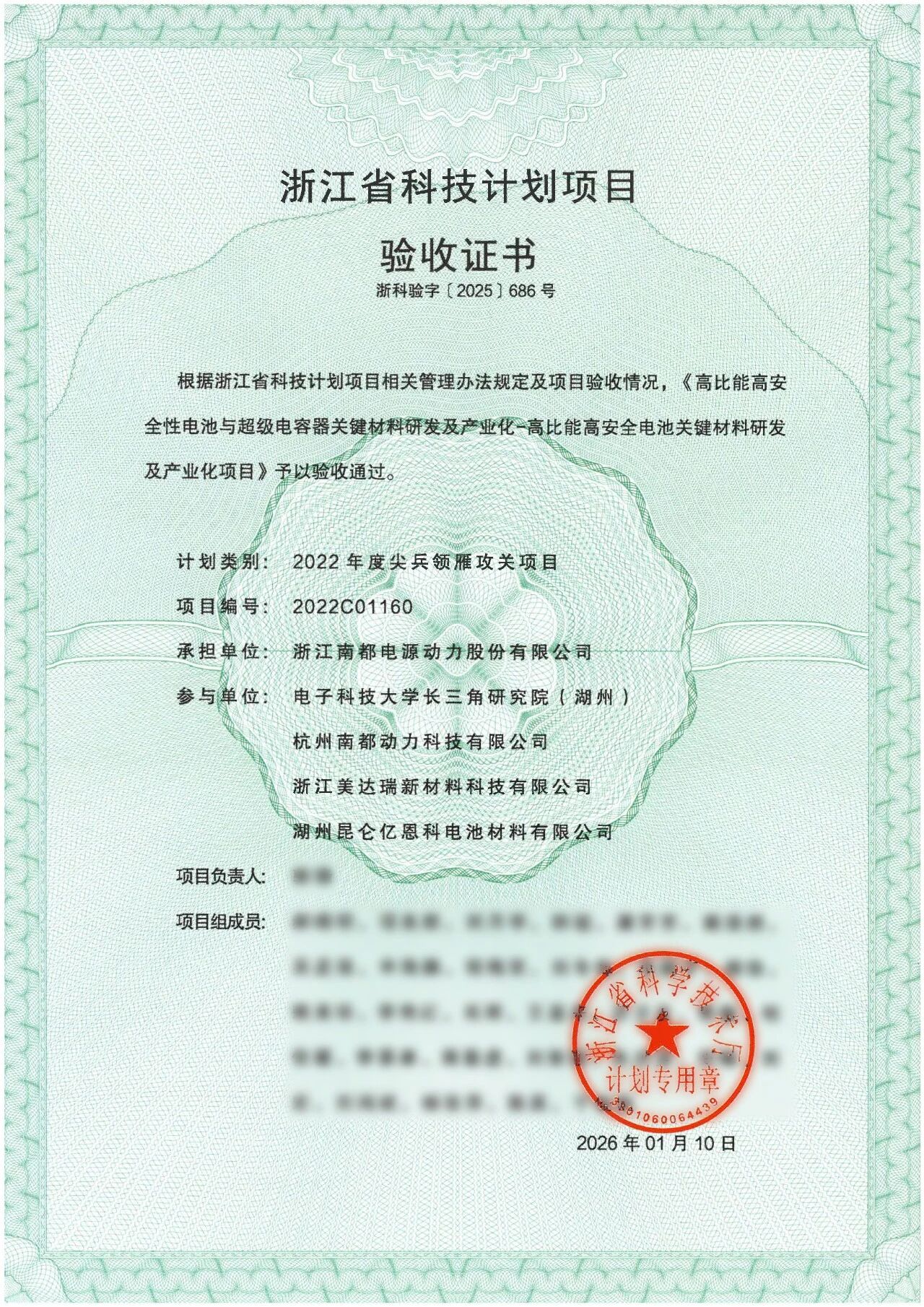日前,南都电源承担的浙江省“领雁”研发攻关计划项目“高比能高安全性电池关键材料研发及产业化项目”(项目编号:2022C01160)顺利通过验收评审。