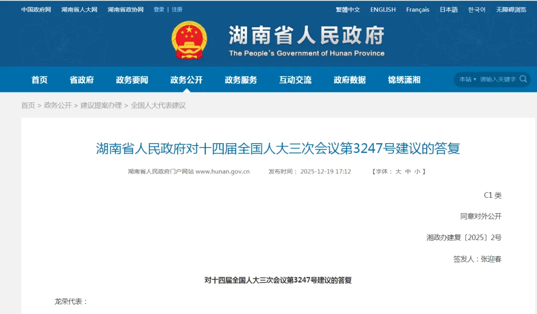 近日,湖南省人民政府发布对十四届全国人大三次会议第3247号建议的答复。