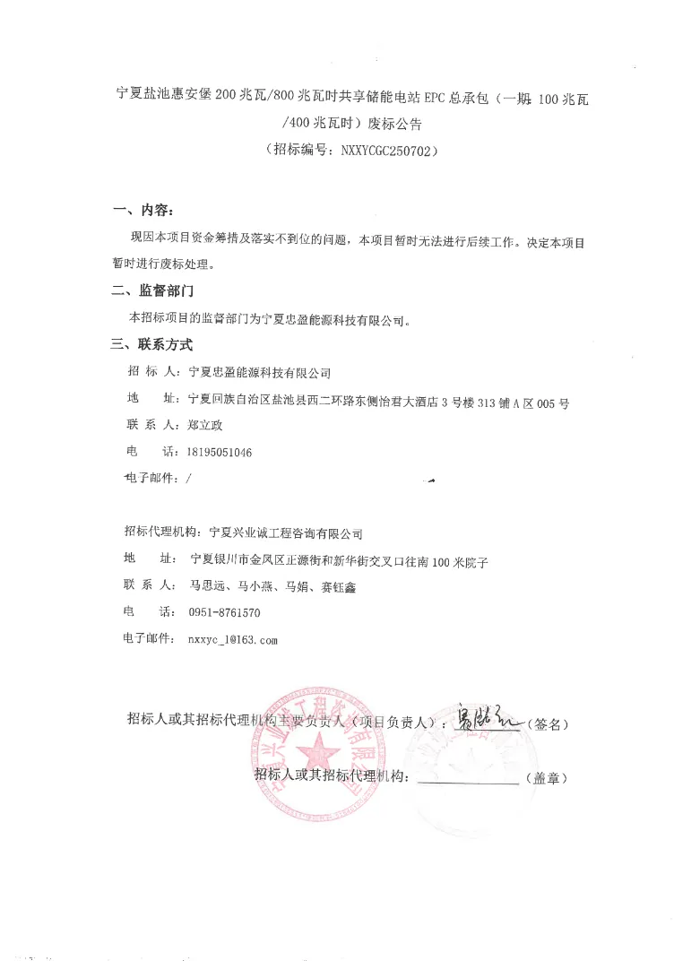 1月14日,宁夏盐池惠安堡200兆瓦/800兆瓦时共享储能电站EPC总承包一期、二期招标项目发布废标公告。