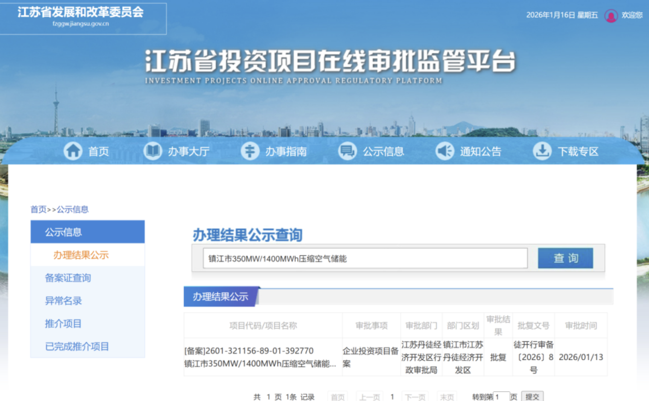 1月13日,江苏丹徒经济开发区行政审批局审批通过350MW/1400MWh压缩空气储能项目企业投资项目备案。