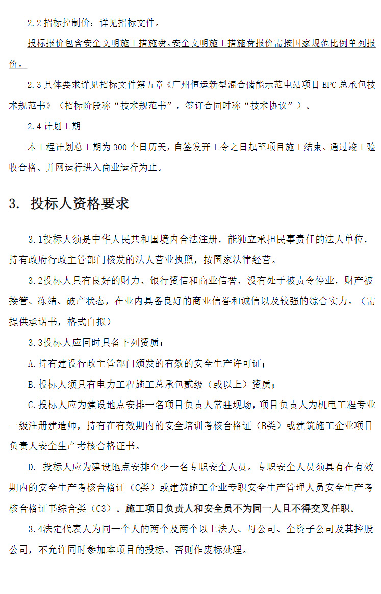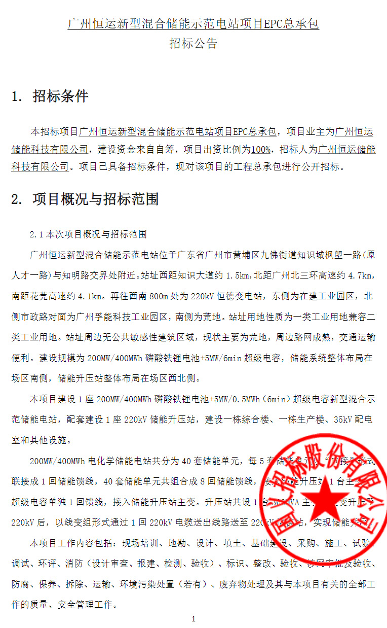 2026年1月17日,广州恒运储能科技有限公司发布广州恒运新型混合储能示范电站项目EPC总承包招标公告,建设资金来自自筹,项目出资比例为100%,计划总工期为300个日历天。