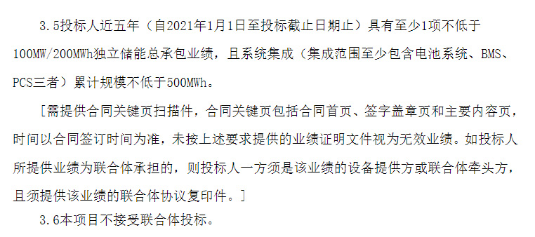 项目要求投标人近五年具有至少1项不低于100MW/200MWh独立储能总承包业绩,且系统集成(集成范围至少包含电池系统、BMS、PCS三者)累计规模不低于500MWh。