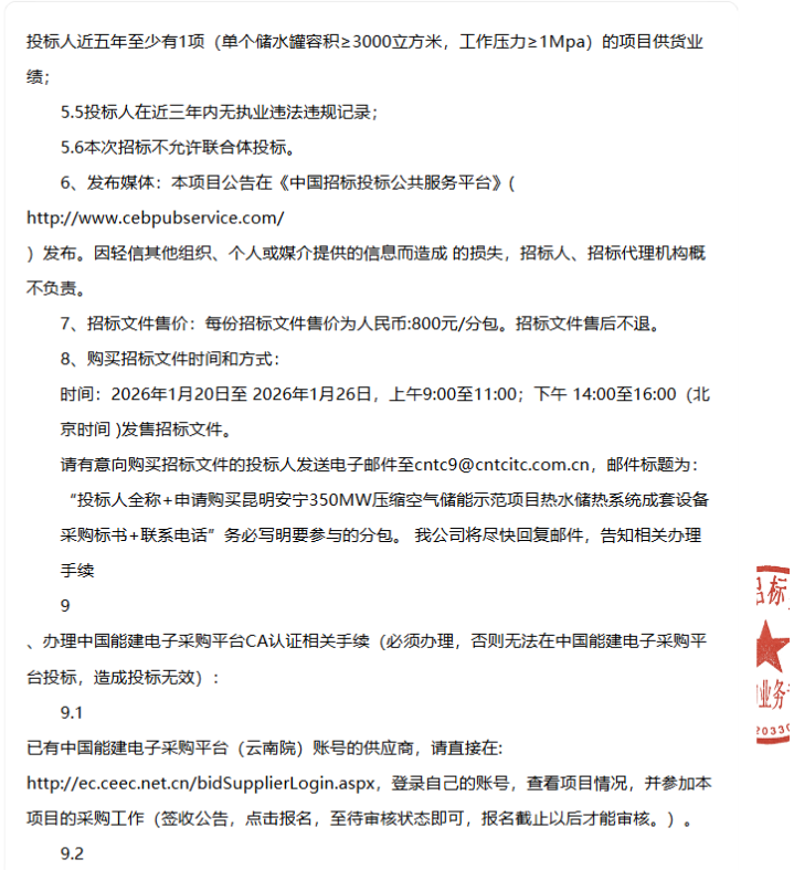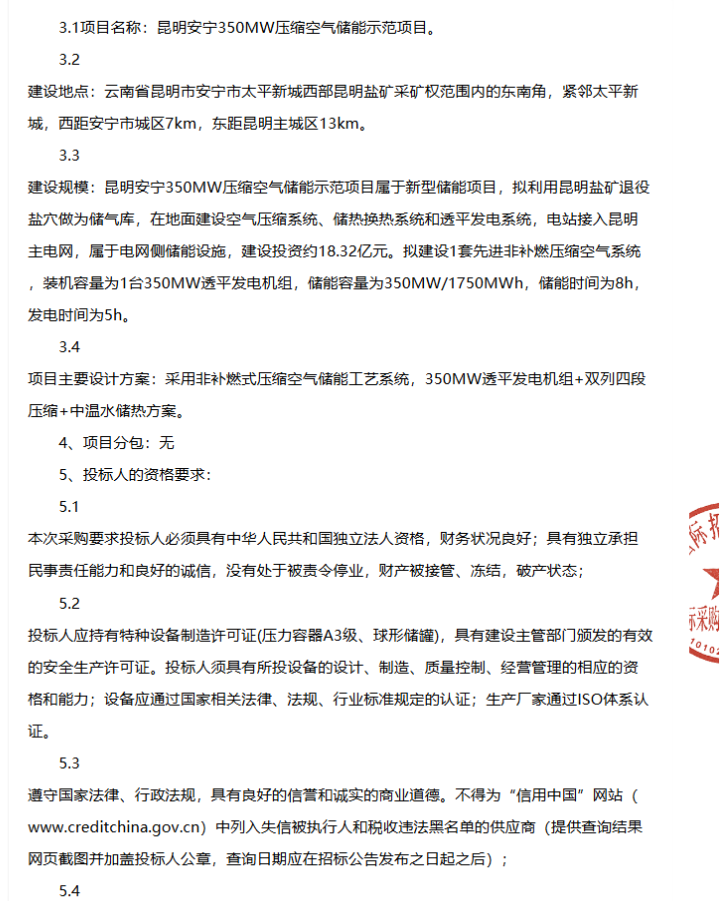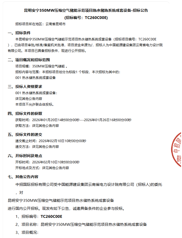 1月20日,昆明安宁350MW压缩空气储能示范项目热水储热系统成套设备招标公告公示。