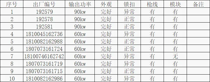 附件显示,该充电站共包含10台充电桩,其中3台90kW、7台60kW,外观均完好、但半数锁扣异常。