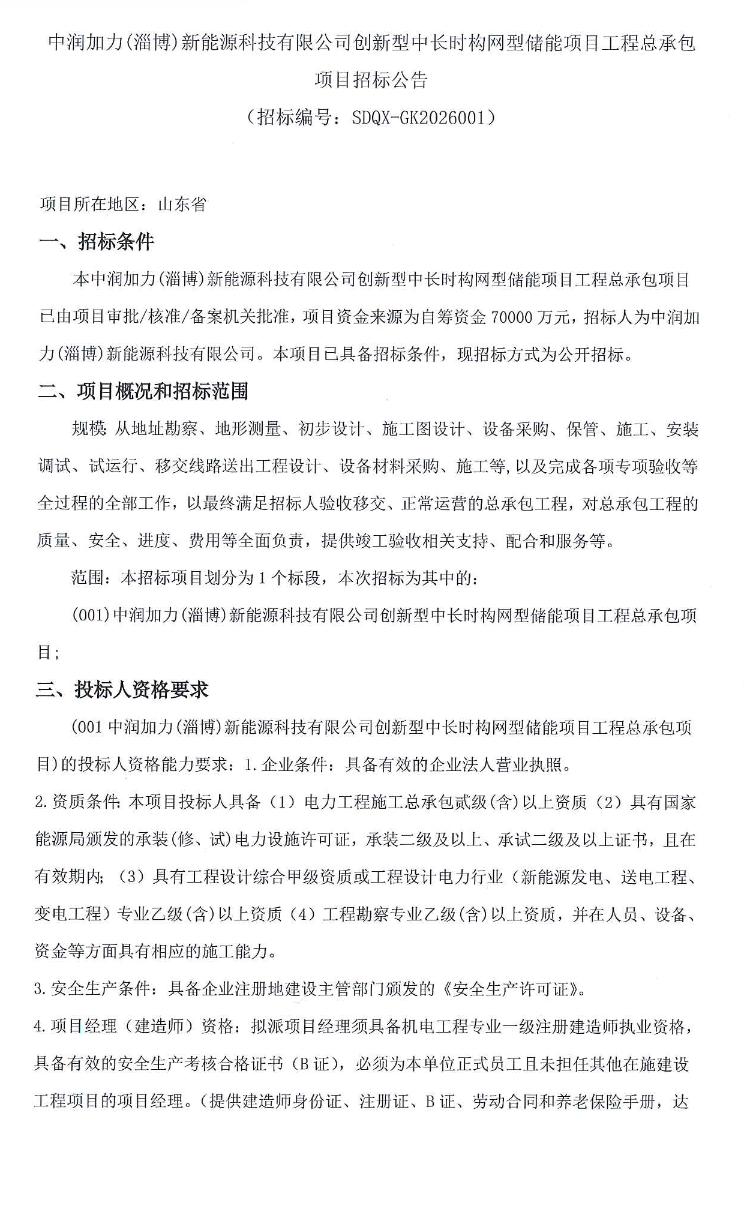 1月23日,中润加力(淄博)新能源科技有限公司创新型中长时构网型储能项目工程总承包项目公开招标,项目资金来源为自筹资金70000万元。