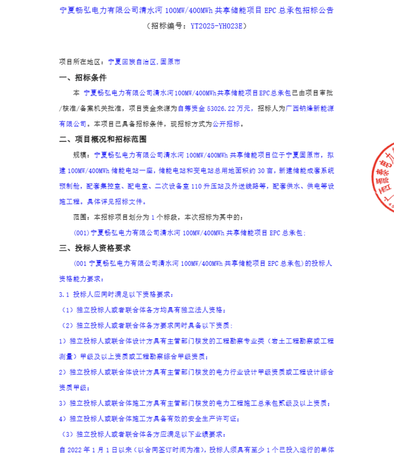 近日,宁夏畅弘电力有限公司清水河100MW/400MWh共享储能项目EPC总承包中标结果公示。