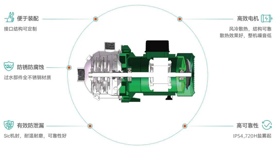 SiC 硬质机封:彻底杜绝泄漏采用硬度高达 HV2000 以上的碳化硅(SiC)硬质机械密封,耐磨性能是石墨密封的 5 倍;搭配双端面冷却设计,在 - 40℃~60℃宽温环境下始终保持密封性能,完美解决温差剧变导致的泄漏难题。