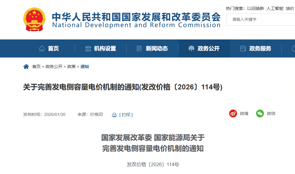 1月30日,国家发展改革委、国家能源局发布关于完善发电侧容量电价机制的通知。