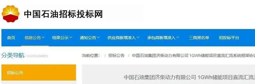 中国石油集团济柴动力有限公司1GWh储能项目直流汇流系统框架协议招标公告