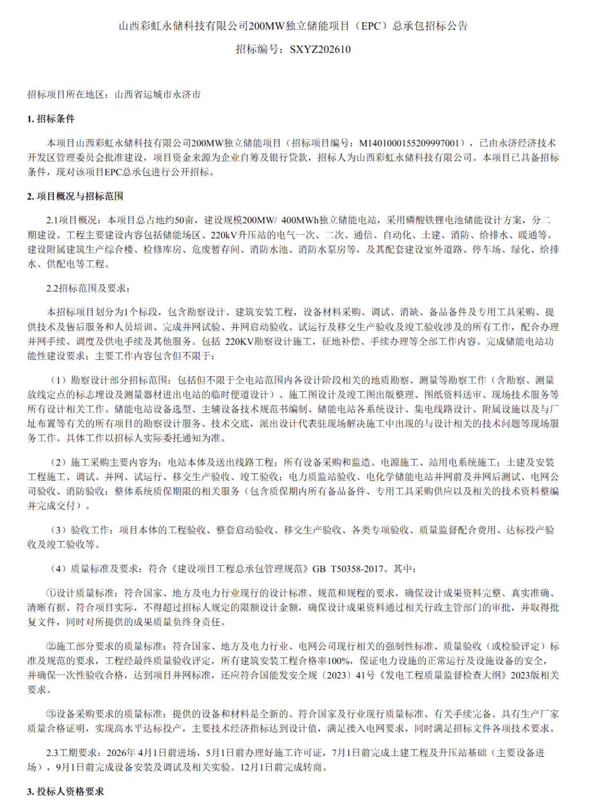 2月3日,山西彩虹永储科技有限公司200MW独立储能项目(EPC)总承包招标公告。