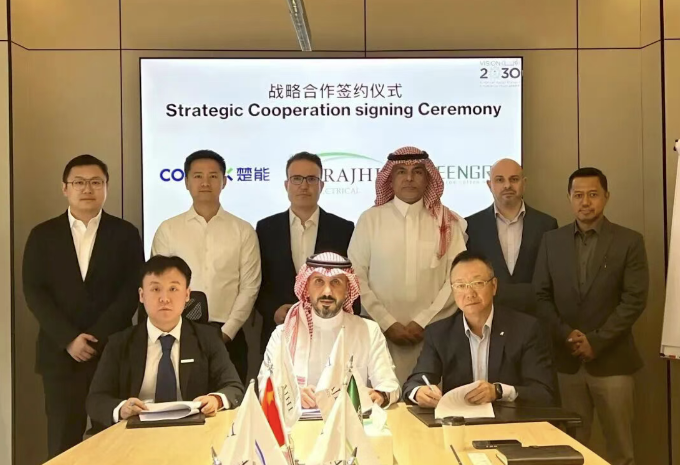 2月3日,楚能新能源与Al Rajhi Electrical、上海亿电通(GREENGRID)在沙特达曼签署储能战略合作协议。楚能海外事业部负责人刘润昌,Al Rajhi Electrical首席执行官Nader AlDhakeel,上海亿电通创始人武杨等三方代表共同见证签约。