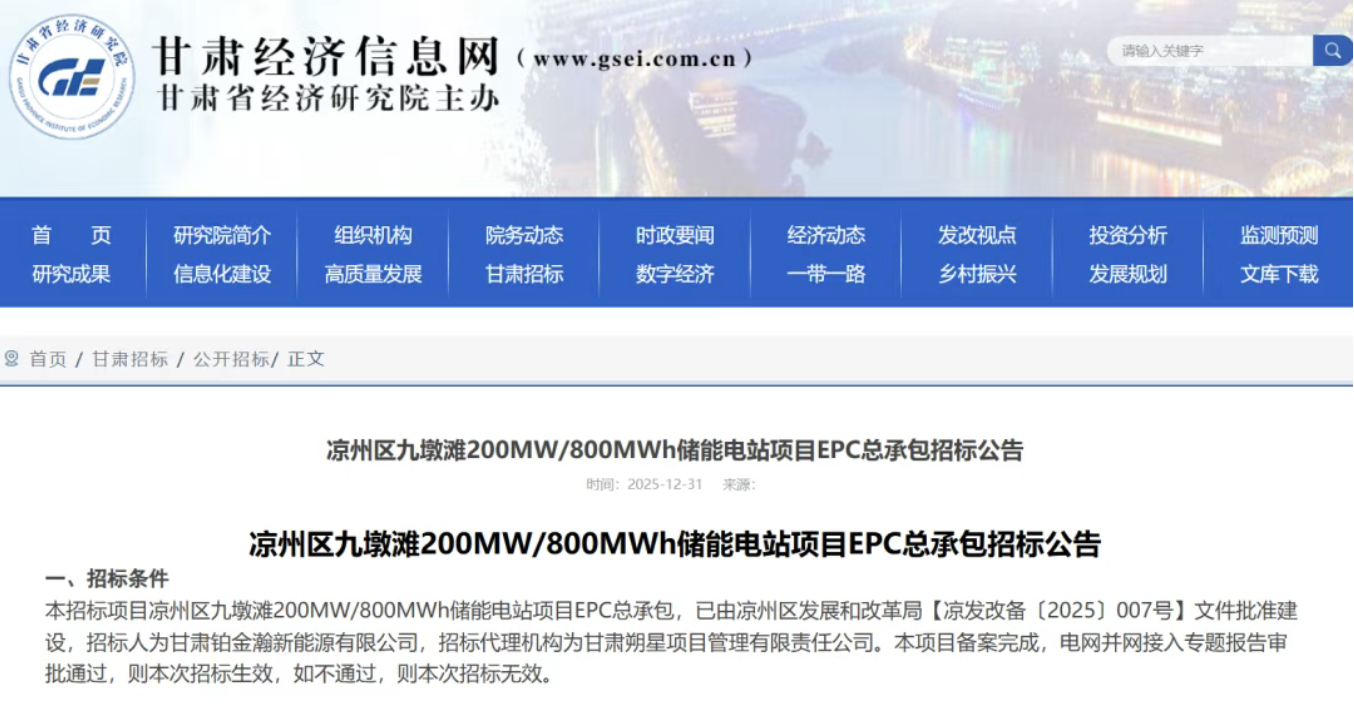 根据此前2025年12月31日发布的招标公告显示,该项目建设地点位于甘肃省武威市凉州区九墩滩光伏园区,核心定位为打造高效、安全、可靠的独立储能电站,重点助力光伏等清洁能源的高效消纳与稳定并网,破解新能源发电波动性、间歇性难题。