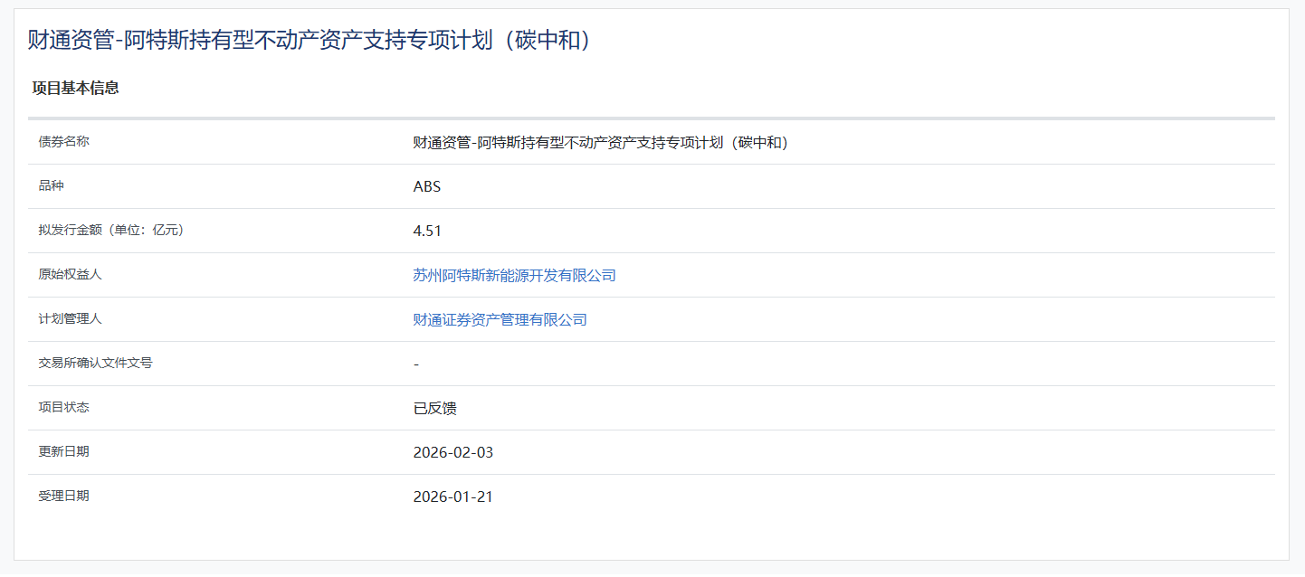 2月3日,据上交所网站信息显示,财通资管-阿特斯持有型不动产资产支持专项计划(碳中和)项目状态更新为已反馈。该项目原始权益人为苏州阿特斯新能源开发有限公司,拟发行金额为4.51亿元。