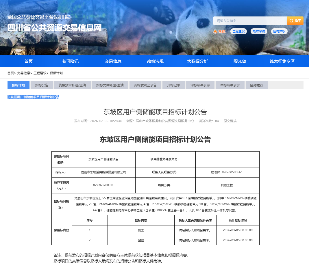 2月5日,四川省眉山市东坡区用户侧储能项目招标计划公告发布。