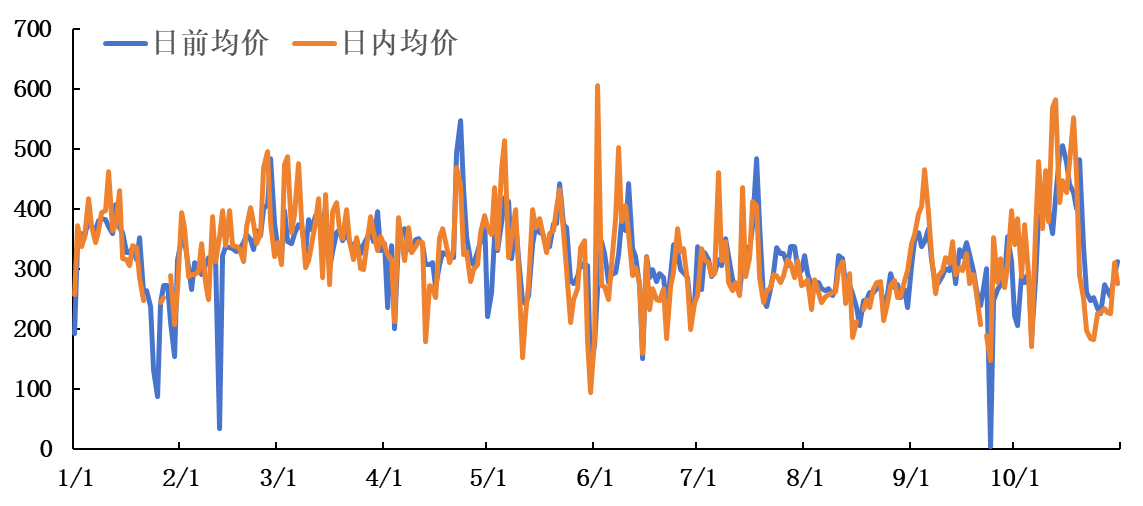 国际成熟市场经验表明,日前现货价格由于具备良好的时间连续性、市场代表性及预测稳定性,常被作为电力期货合约的首选定价基准。为检验该基准在我国新兴电力市场环境中的适用性,本节基于2025年1月至10月广东电力现货市场的实际运行数据,对日前均价与日内均价进行系统的统计对比与相关性分析,旨在为我国电力期货合约的基准选择提供实证依据。