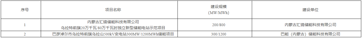 内蒙古汇锦储能科技有限公司、巴能(内蒙古)储能科技有限公司分别中选乌拉特前旗200MW//800MWh独立新型储能电站示范项目、巴彦淖尔市乌拉特前旗乌拉山500kV变电站300MW/1.2GWh储能项目。