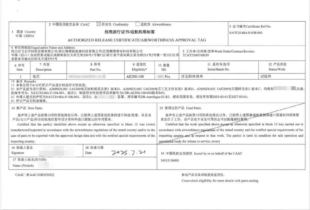 赣锋锂业该型号电芯已于2025年7月通过沃飞长空及局方共同开展的制造符合性检查,并收到局方签核的批准放行证书。