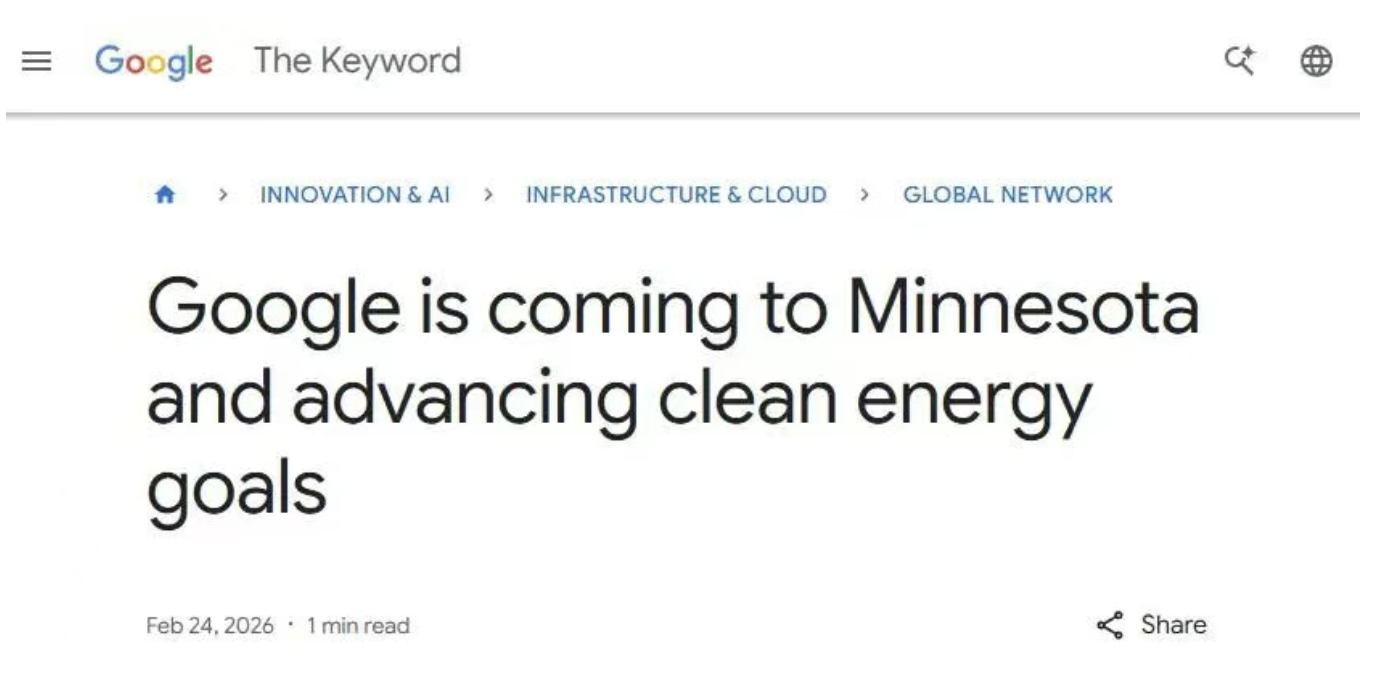 据获悉,当地时间2月24日,Google 谷歌在官网宣布将在美国明尼苏达州 Pine Island 建设新的数据中心。为确保这一项目的电力需求不会影响到当地用户的电费订单,谷歌与 Xcel Energy 达成了一份清洁能源购电协议,加速创新能源解决方案的实施。