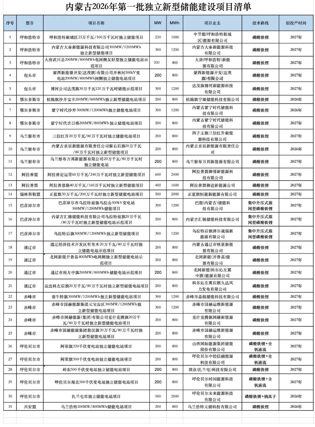 根据项目清单,共有31个项目纳入2026年第一批独立新型储能建设清单,合计规模为8.15GW/32.6GWh,项目皆采用电化学储能技术,拟投产年度为2026年和2027年。