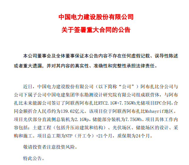 139.62亿大单!中国电建签订阿联酋2.1GW+7.75GWh光储项目EPC合同