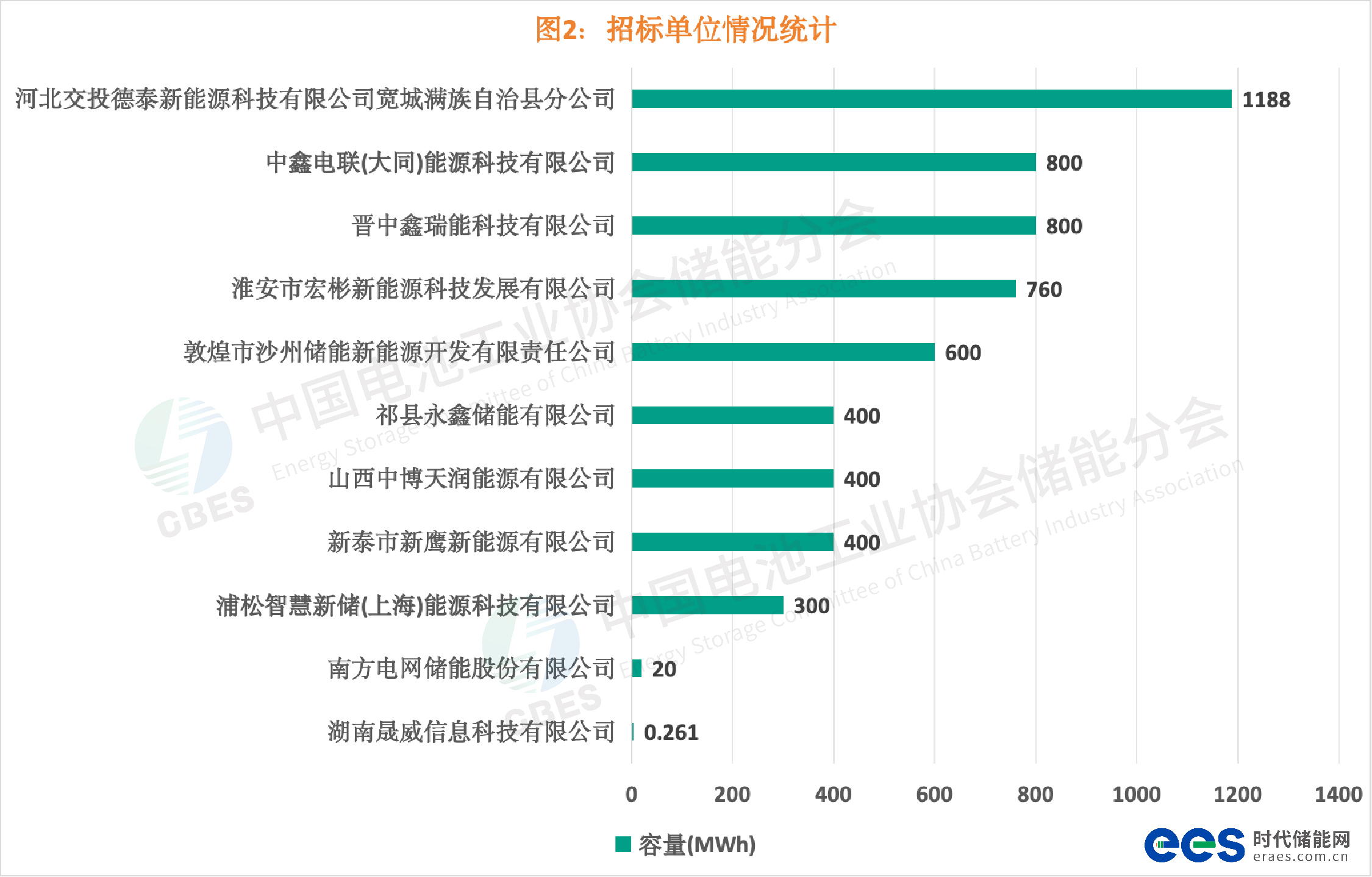 招标单位规模情况统计,TOP5分别是:河北交投德泰新能源科技有限公司宽城满族自治县分公司1188MWh;中鑫电联(大同)能源科技有限公司800MWh;晋中鑫瑞能科技有限公司800MWh;淮安市宏彬新能源科技发展有限公司760MWh;敦煌市沙州储能新能源开发有限责任公司600MWh。