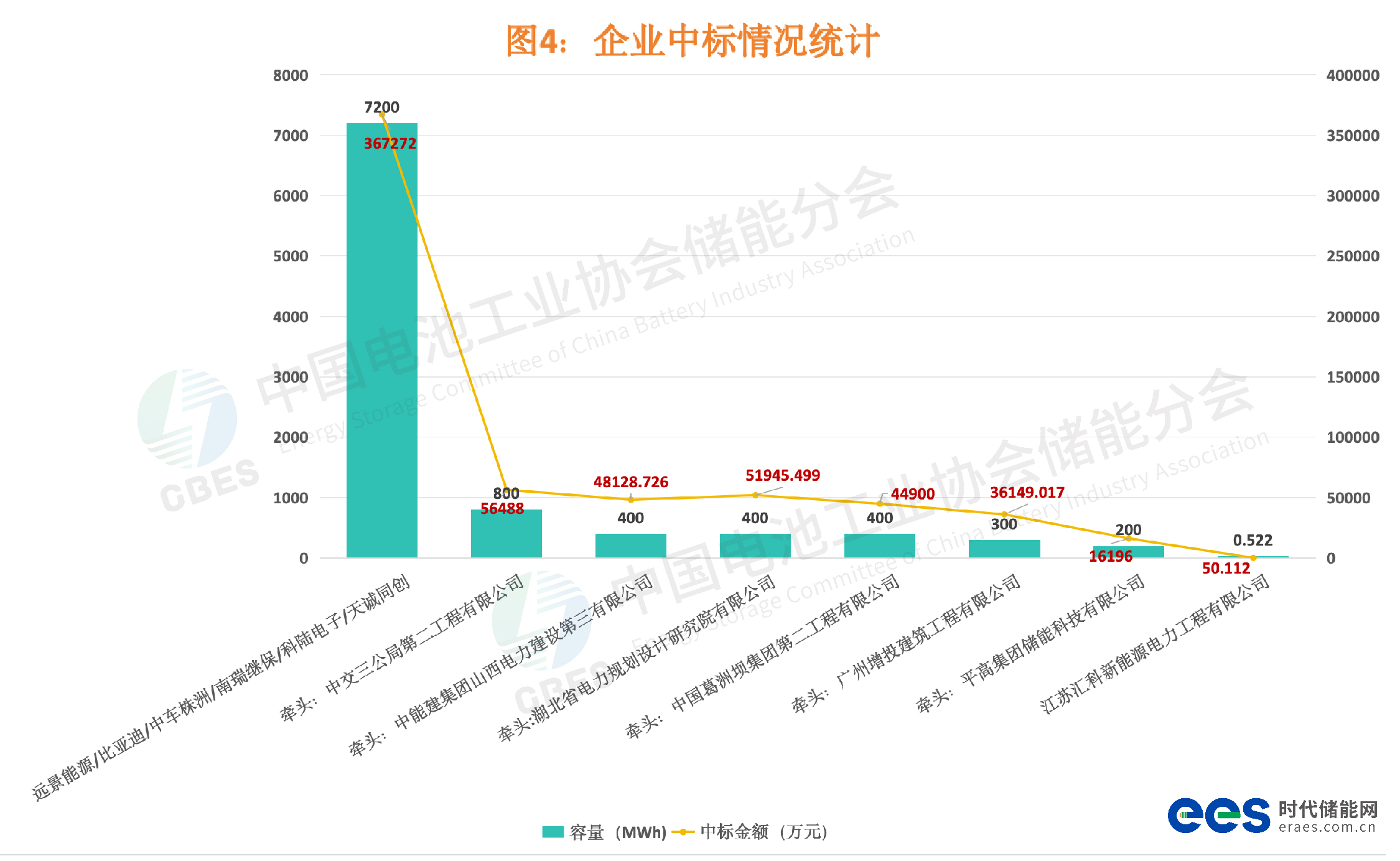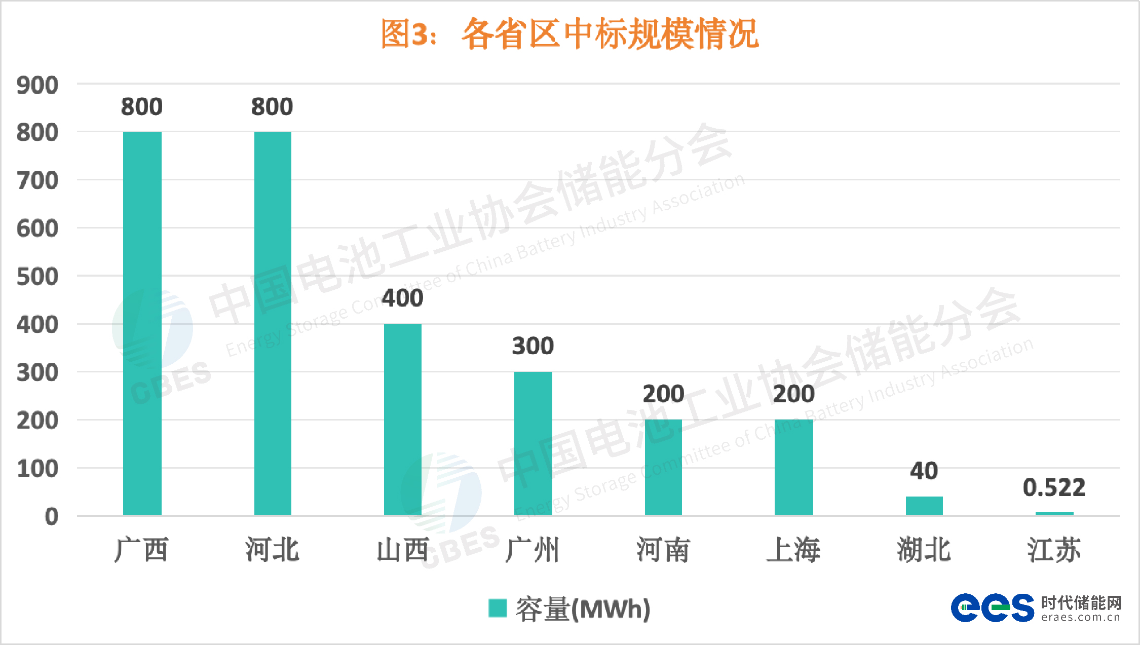 各省区中标规模情况,TOP5分别是:广西、河北并列第一,均为800MWh;山西400MWh;广州300MWh;河南、上海并列第四,均为200MWh;湖北40MWh。