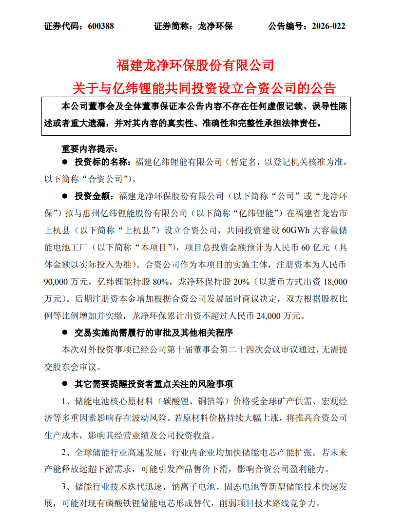 4月8日,龙净环保发布公告,拟与锂电龙头亿纬锂能在福建省龙岩市上杭县共同设立合资公司,投资建设一座60GWh大容量储能电池工厂,项目总投资预计达到60亿元。这家传统大气污染治理装备龙头企业,正以较低出资比例(持股20%,累计出资不超过2.4亿元)切入储能电芯制造核心环节,标志着其新能源战略布局进入实质性深化阶段。