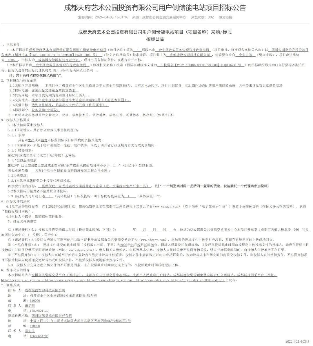 近日,四川省成都天府艺术公园投资有限公司用户侧储能电站项目招标公告发布。业主及招标人为成都城投智源科技有限公司,为成都市城投集团下属企业。建设资金来自业主自筹。