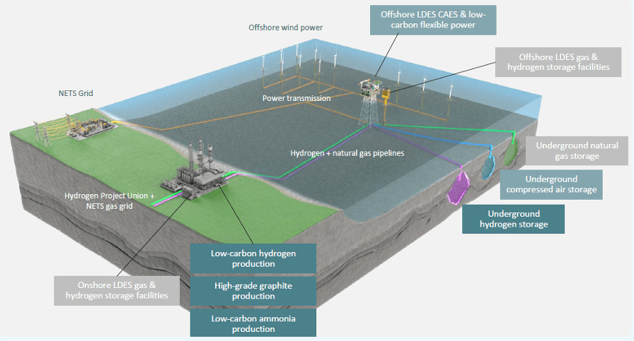 值得注意的是,该项目不仅是单一储能设施,而是EnergyPathways推动的MESH综合能源系统的一部分。围绕海上盐穴储能,公司同步规划建设天然气与氢气储存设施,并在巴罗因弗内斯打造陆上能源产业园区,布局低碳制氢及石墨生产。陆上与海上设施将通过改造后的天然气管道连接,具备未来氢气输送能力。