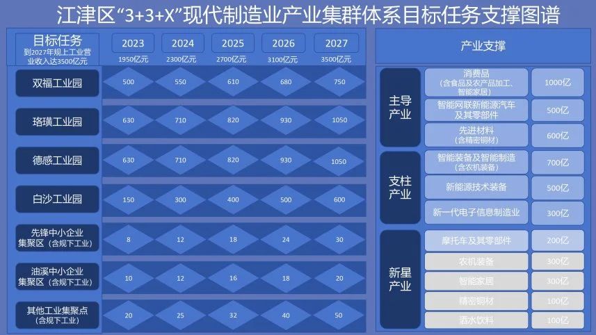 围绕成渝地区双城经济圈建设国家重要产业备份基地和打造世界级先进制造业集群方向,大力承接国家重大生产力布局,深度融入重庆市“33618”现代制造业集群发展体系,构建江津区“3+3+X”现代制造业产业集群体系,打造一批在全市和西南地区具有影响力的产业基地和产业集群,更好支撑服务市域、成渝地区双城经济圈现代化产业体系建设。
