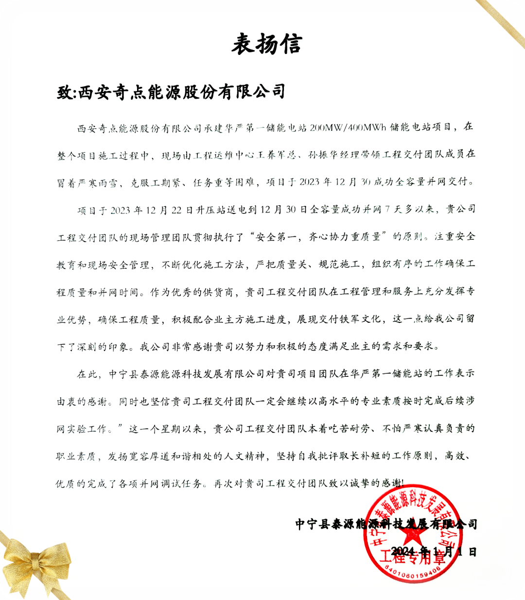 得益于工程交付团队的专业、敬业,华严第一储能电站项目按时、保质、保量完成并网投运。项目公司中宁县泰源能源科技发展有限公司以一面锦旗、一封感谢信,对奇点工程交付团队表示了诚挚感谢和充分肯定。