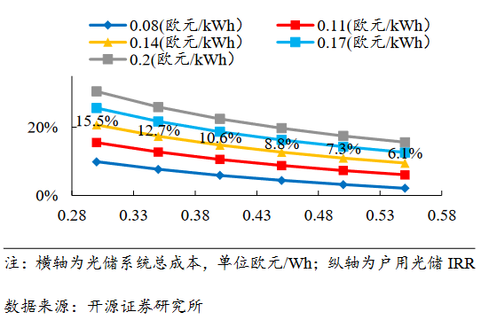 2022年俄乌地缘冲突引发的能源危机向欧洲人民普及了户光、户储等绿色能源产品,伴随储能光伏系统的成本下降与利率进入下行通道,户用光储产品的经济性仍有大幅提升空间。根据测算,在0.11欧元/度的电价和0.35欧元/Wh的光储投资成本下其IRR仍然高达12.7%,投资回收期约为6年。在常规电价水平下,光储系统投资成本的下降有望持续激发当地对户储等绿色能源产品的需求。