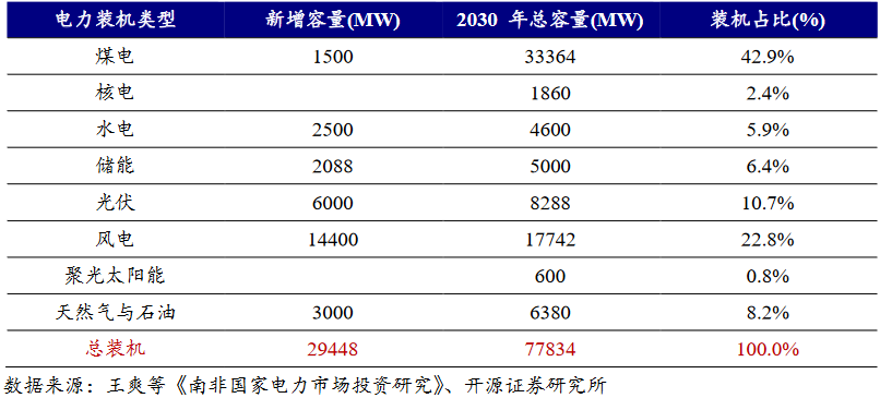 根据德业股份公告显示,2022年南非地区全年累计205天出现了不同程度的停电事故。为了应对能源危机,南非政府规划了大规模的可再生能源发展规划,计划到2030年实现风电、光伏、储能装机容量分别为17.7GW、8.3GW与5GW,到2030年风电、光伏与储能的装机占比有望分别达22.8%、10.7%与6.4%。
